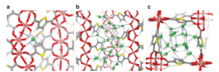 圖3:CAU-23通道內(nèi)吸附水分子的優(yōu)先排列。a. 第一個(gè)吸附水分子與兩個(gè)相鄰的μ-OH位點(diǎn)相互作用,形成強(qiáng)氫鍵。b.沿CAU-23通道橫截面繪制的氫鍵聯(lián)接水分子的聚集。c. 裝水渠道俯視圖。