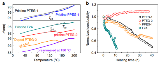 b不同摻雜富勒烯衍生物在150°溫度下歸一化電導(dǎo)率的演化。