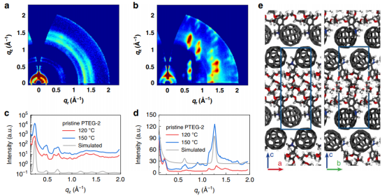 圖3:PTEG-2薄膜的分子組裝。a、 b在(a)120°C和(b)150°C和(C,d)下退火的原始PTEG-2薄膜的2D-GIWAXS圖案,以及相應(yīng)的線切割和模擬散射線切割(在這兩種情況下,模擬線切割都以線性標(biāo)度繪制);分子動力學(xué)模擬原子解析的PTEG-2分子堆積的代表性快照;單位細(xì)胞以藍(lán)色突出顯示。
