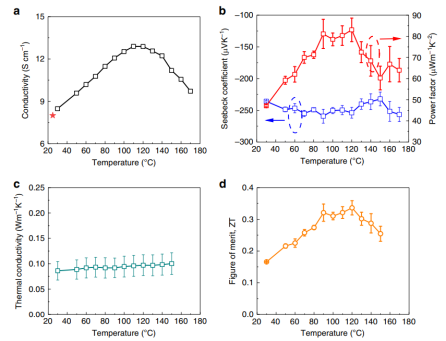 圖5:與溫度有關(guān)的熱電參數(shù)。對于摻雜濃度為5wt%的PTEG-2薄膜,在不同工作溫度下的a導(dǎo)電性(紅星代表冷卻至25°C后的導(dǎo)電性),b塞貝克系數(shù)(藍(lán)色)和功率因數(shù)(紅色),c面內(nèi)導(dǎo)熱系數(shù)和d優(yōu)值,ZT。誤差條(b、c)表示通過最佳擬合得到的塞貝克系數(shù)和導(dǎo)熱系數(shù)的標(biāo)準(zhǔn)誤差;誤差條(d)代表ZT的相應(yīng)計(jì)算偏差。