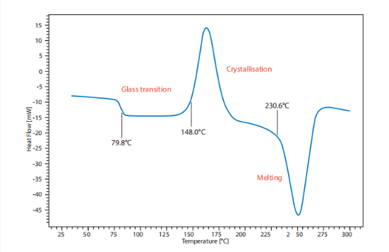 在本實驗中,對PET顆粒進行加熱,再進行淬火冷卻使其成為非晶態(tài),然后使用Chip-DSC按照50K/min的線性加熱速率進行分析。該曲線顯示,PET顆粒在80℃呈現(xiàn)明顯的玻璃化轉變,隨后在148℃呈現(xiàn)冷結晶的非晶態(tài),并在230℃出現(xiàn)熔融峰。
