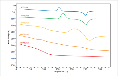 Chip-DSC可以實現(xiàn)非??斓募訜崴俾省T赑ET樣品的初始快速淬火冷卻后,分別以50、100、300、600和800K/min的加熱速率對PET樣品進行測量。只有使用相對緩慢的加熱速率時,才能觀察到冷結晶峰。在很高的加熱速率下,結晶太慢,相應的峰消失。由于樣品仍處于非晶態(tài),并且只有結晶部分可以熔化,因此不再觀察到熔化峰。