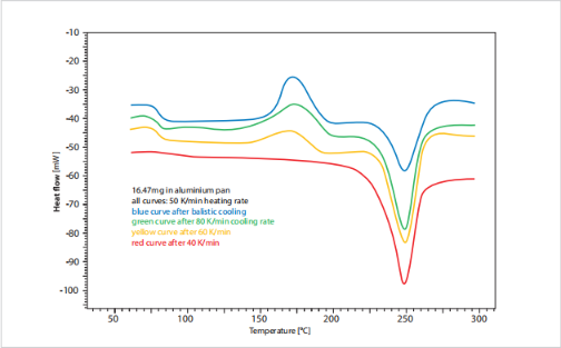 根據(jù)冷卻速度的不同,聚合物PET的結晶度等級會發(fā)生顯著變化。在隨后的加熱過程中,只有在快速冷卻過程中,在結晶未完成時,才能觀察到冷結晶。如果之前的冷卻很慢,則無法觀察到玻璃化轉變或結晶。LINSEIS Chip-DSC可實現(xiàn)快速彈道式冷卻速率,而無需任何額外冷卻器 ,即可進行高冷卻速率的實驗。