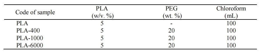 采用三種不同平均分子量的聚乙二醇作為聚乳酸的增塑劑,它們的平均分子量分別為400、1000和6000 g/mol(用PEG 400、PEG 1000和PEG 6000表示)。通過溶劑澆鑄法制備PLA/PEG共混物,樣品配方如下表所示,然后在氯仿中以125 rpm的轉(zhuǎn)速混合6小時(shí),直到得到澄清的溶液。得到的混合物被澆鑄在玻璃培養(yǎng)皿中并干燥過夜。在測試前,將薄膜樣品放在50℃的真空烘箱中干燥。