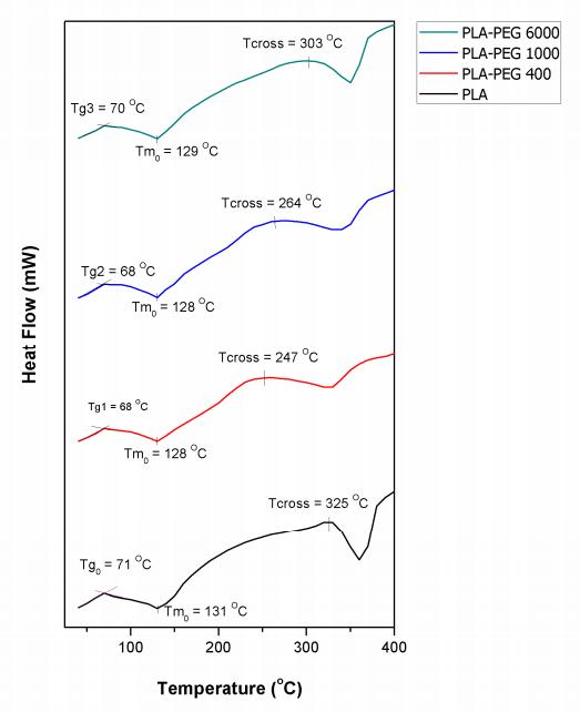 本研究以聚乙二醇(PEG)為增塑劑,通過溶劑澆鑄共混法對(duì)聚乳酸(PLA)進(jìn)行了改性,使用LINSEIS TGA-DSC對(duì)PLA/PEG共混物進(jìn)行了熱性能分析,結(jié)果表明,加入較低分子量的PEG 400和PEG 1000可以降低Tg和Tm,這是由于PLA和PEG之間通過氫鍵作用,使鏈遷移率提高,從而使PLA進(jìn)入更多的非晶態(tài)。同時(shí),與其他較低分子量的PLA相比,高分子量(PEG 6000)的加入導(dǎo)致Tg逐漸增加,這很可能是由于隨著分子量的增加,聚合物之間的相容性降低導(dǎo)致的。其次,在熱穩(wěn)定性方面,PLA/PEG共混物(PEG 1000和PEG 6000)的降解過程較慢,這是由于隨著分子量的增加,增塑劑的聚合鏈較長,可以在聚合物基體表面起到屏障保護(hù)層的作用,從而延緩分解過程。