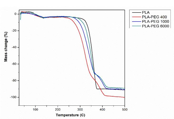 PLA和PLA/PEG共混物的TGA曲線如下圖所示。結(jié)果表明,與改性PLA/PEG相比,純PLA表現(xiàn)出更高的起始降解溫度,為308℃,而改性PLA/PEG 400、PLA/PEG 1000和PLA/PEG 6000的起始降解溫度分別在252℃、275℃和292℃左右。這也與DSC測試結(jié)果相一致,與改性PLA/PEG相比,純PLA的交聯(lián)降解溫度更高,約為325℃。