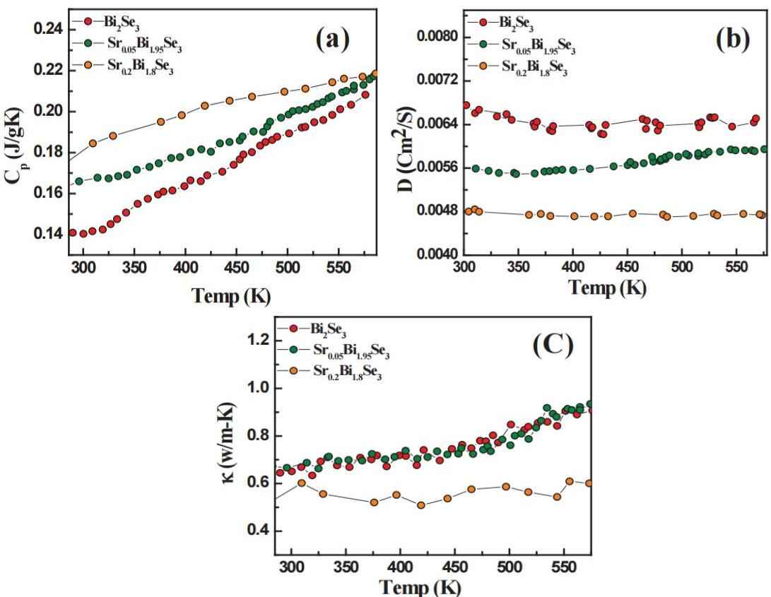 通過(guò)對(duì)SrxBi2-xSe3 (x=0, 0.05, 0.2)的熱輸運(yùn)性質(zhì)進(jìn)行研究分析,可以看到,隨著Bi2Se3中Sr含量的增加,其導(dǎo)熱系數(shù)降低,而隨著溫度的升高,導(dǎo)熱系數(shù)保持穩(wěn)定。熱導(dǎo)率的降低歸因于Bi2Se3結(jié)構(gòu)中的鍶嵌入導(dǎo)致的層狀結(jié)構(gòu)生長(zhǎng)和缺陷。熱導(dǎo)率的降低為進(jìn)一步探索該體系的其他熱電參數(shù)提供了空間,從而得出該體系的熱電性能。