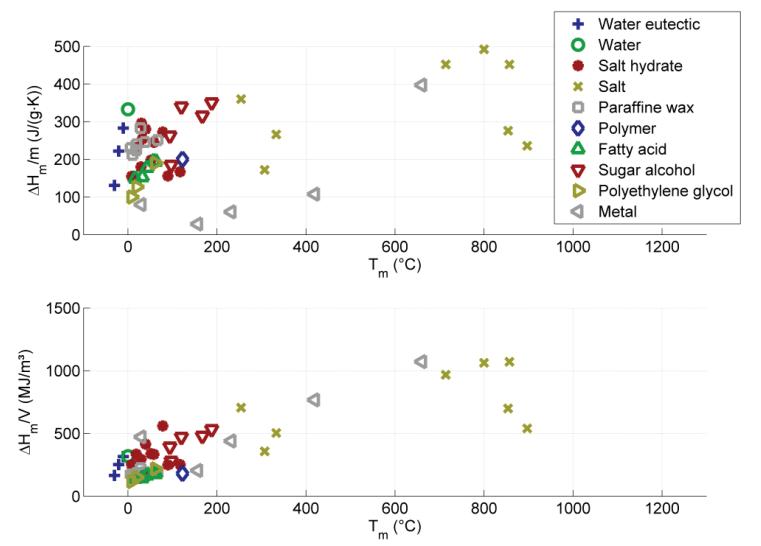 圖1:與蓄熱應用中不同可能的相變材料的質(zhì)量和體積相關的比熔融焓概述。