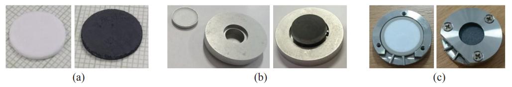 圖2:(a) :圓柱形固體樣品(左)和石墨涂層(右);(b) :裝有樣品和蓋子的鋁制液體容器(左),底部為石墨涂層(右);(c) :內(nèi)有樣品、外有鋼支架的聚醚醚酮環(huán)(左),并與石墨涂層的聚醚醚醚環(huán)上下側(cè)的鋼板組裝(右)。
