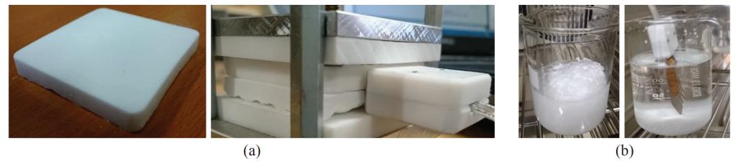 圖3:(a) :制備兩個樣品塊(左),并將箔傳感器放置在具有規(guī)定接觸壓力的塊之間(右);(b) :在熔爐中熔化PCM(左),并將傳感器放入液體中(右)。