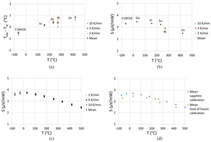 圖4:(a):熔融Tei,m的外推初始溫度(b):根據(jù)熔融焓(c)評估的靈敏度S(T):根據(jù)藍寶石測量評估的靈敏度S(T)(d):根據(jù)熱量和熱流校準進行的靈敏度比較。