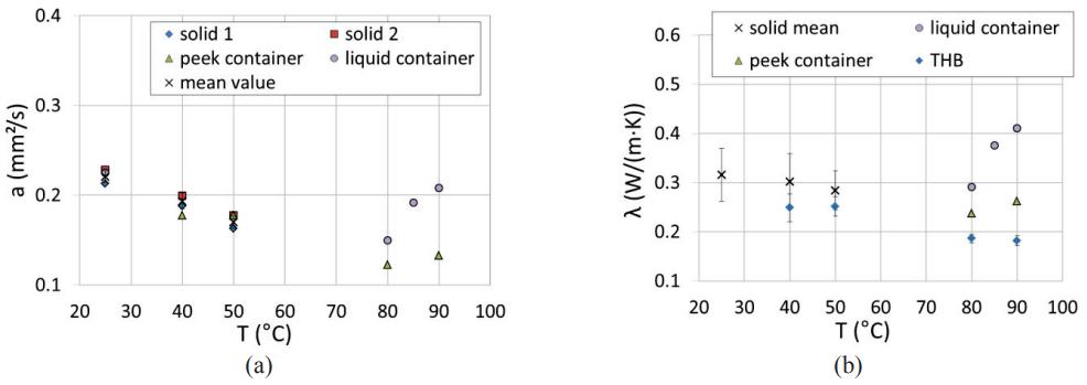 圖6:(a) :使用液體容器和PEEK環(huán)形容器的純固體和液體樣品的熱擴散率LFA結(jié)果(b):使用THB方法直接測量熱導率,并通過從LFA和DSC獲得的λ(T)=ρ(T)·cp(T)·a(T)計算熱導率。