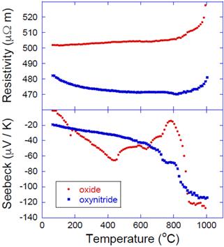 Denis Music等人利用密度泛函理論系統(tǒng)地探討了鈮氧化物(空間群 Pm-3m)中 1a 和 1b 空位分別由鈮和氮填充的問(wèn)題,從而設(shè)計(jì)出具有較大塞貝克系數(shù)的化合物。最主要的效應(yīng)是在1b Wyckoff位點(diǎn)填入氮后,塞貝克系數(shù)增加了5倍。這個(gè)結(jié)果可以從電子結(jié)構(gòu)上理解,鈮的非金屬p軌道雜化引發(fā)量子約束,使塞貝克系數(shù)得以增強(qiáng)。通過(guò)測(cè)量濺射Nb-O-N薄膜的塞貝克系數(shù),可以驗(yàn)證這一點(diǎn)。使用林賽斯的塞貝克系數(shù)/電阻測(cè)試儀LSR-3/1100同時(shí)測(cè)量了Nb-O-N薄膜的塞貝克系數(shù)和電阻率。在800 °C這些導(dǎo)電氮氧化物的塞貝克系數(shù)為-70 μV/K,這是有史以來(lái)報(bào)道這些化合物中絕對(duì)值最大的。
