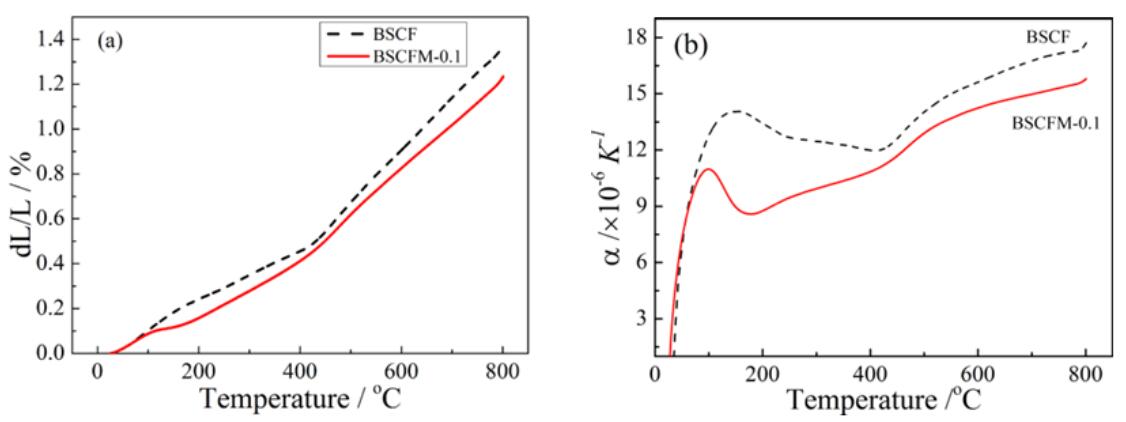 如下圖(a)所示顯示了BSCF和BSCFM-0.1在升溫速率為5°C/min,從室溫升至800℃的相對長度變化,二者的整體膨脹行為相似,但在整個測試溫度范圍內(nèi),BSCFM-0.1的熱膨脹曲線比BSCF的熱膨脹曲線平緩。從曲線上看,試樣在100℃和450℃附近有兩個明顯的變化。在100℃附近,出現(xiàn)拐點的原因可能是水分蒸發(fā)和氣體釋放的影響。450℃附近的拐點更明顯,其原因主要與晶格氧的損失有關(guān),其次是B位的Co4+/Fe4+熱還原為Co3+/Fe3+。