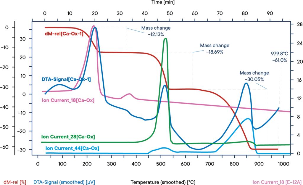 紅色的熱重(TG)曲線顯示出三個(gè)明顯的質(zhì)量損失階段,這些階段在藍(lán)色的差示掃描量熱(DSC)曲線中也表現(xiàn)為吸熱現(xiàn)象。大約在 150 ℃ 時(shí)的第一個(gè)階段是結(jié)晶水的失去,從質(zhì)譜圖中可以看到,此時(shí)質(zhì)量數(shù)為 18 的離子流強(qiáng)度增加。在 450 ℃ 時(shí)的第二個(gè)變化顯示出一個(gè)一氧化碳分子的失去,這可以通過質(zhì)量數(shù)為 28 的離子流曲線監(jiān)測到。最后,大約在 750 ℃ 時(shí)的第三個(gè)階段顯示出二氧化碳的失去,在質(zhì)量數(shù)為 44 的離子流曲線上表現(xiàn)為一個(gè)峰值。
