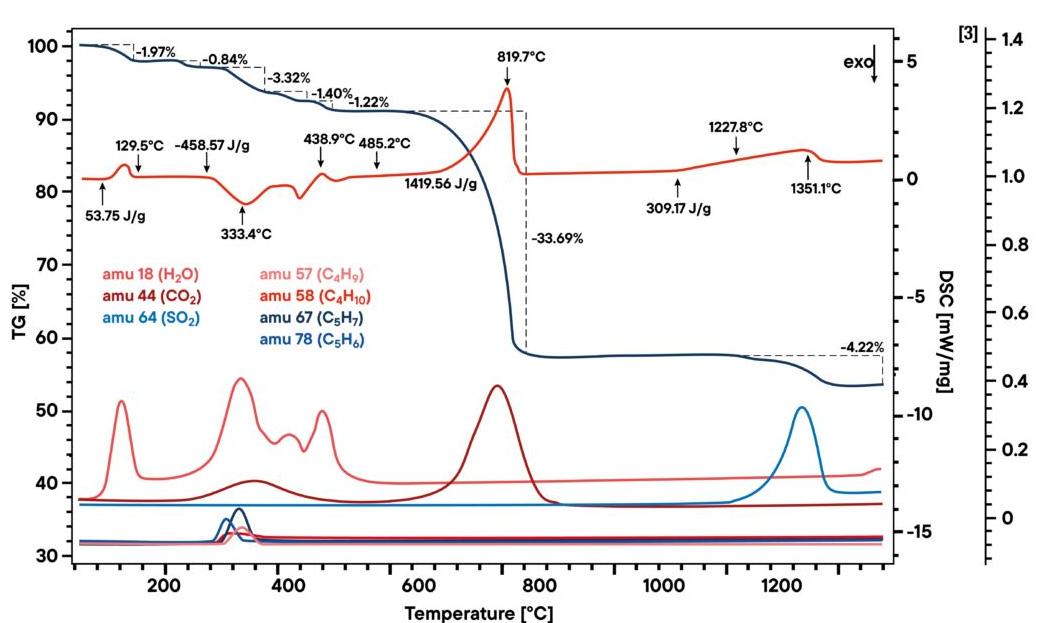 使用 STA 和 L40 EGA QMS 進(jìn)行分析。圖中顯示的是同時(shí)進(jìn)行的熱重分析(TG,上深藍(lán)色曲線)與差示掃描量熱分析(DSC,上紅色曲線)和質(zhì)譜分析(MS)。通過質(zhì)譜分析,可以確定材料中的揮發(fā)氣體。質(zhì)譜法顯示了低溫下 H2O 的峰值,很可能來自石膏。DSC 峰值和質(zhì)譜儀在 300 ℃ - 400 ℃ 之間的信號表明有機(jī)成分已經(jīng)分解。約 800 ℃ 的 CO2 峰表明 CaCO3 已分解。在 1300 ℃ 時(shí),CaSO4 分解(SO2 峰)。