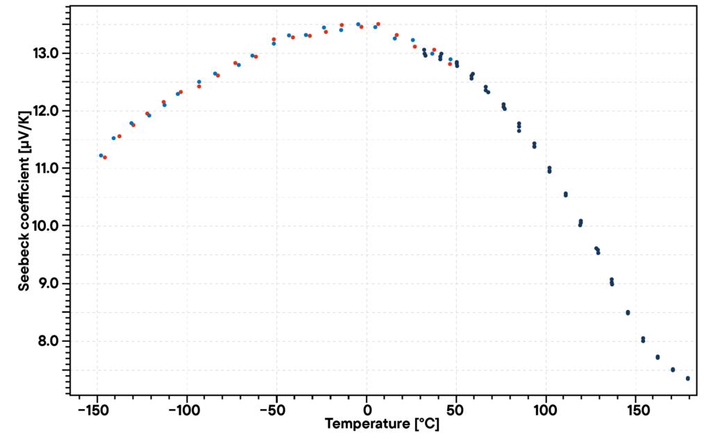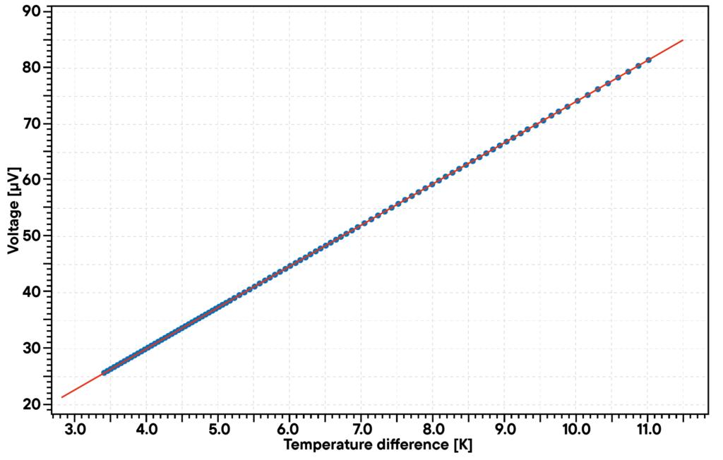 在梯度加熱功率掃描過程中,測量塞貝克電壓 / 溫度梯度(藍色),并與線性回歸曲線(紅色)對比。塞貝克系數(shù)通過線性回歸的斜率確定,確保測量結(jié)果的精確性。