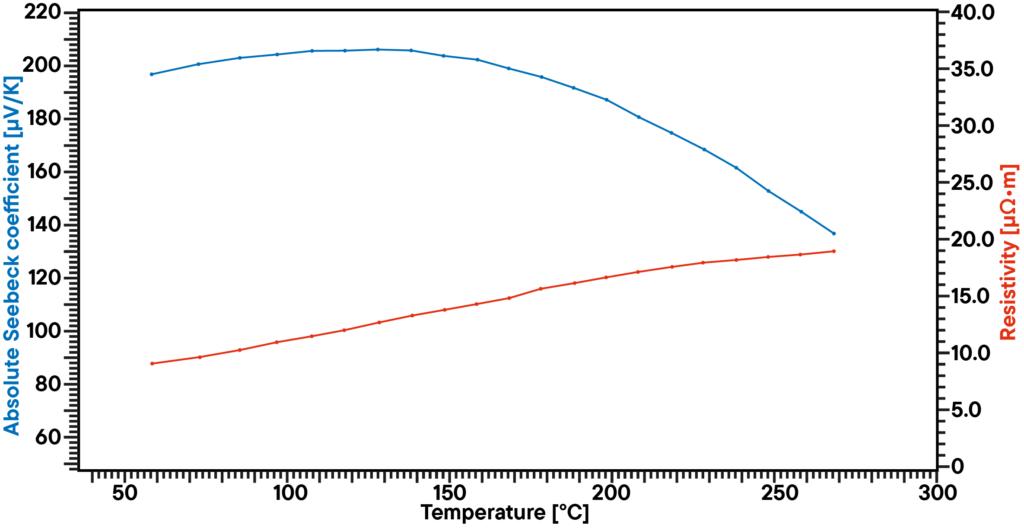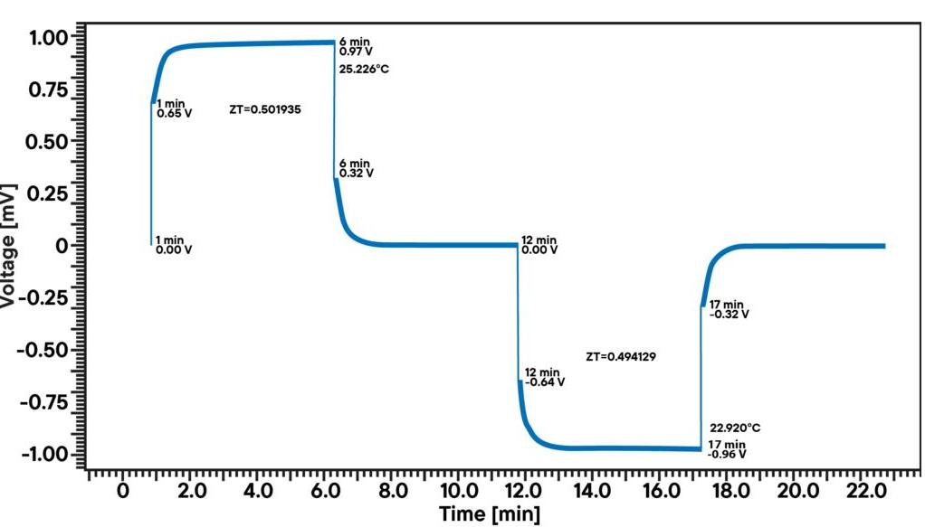 在本應(yīng)用案例中,通過確定歐姆電壓降和熱電電壓降之間的關(guān)系,就可以輕松計(jì)算出室溫下的 ZT 值,室溫下測得的 ZT 值為 0.50 。