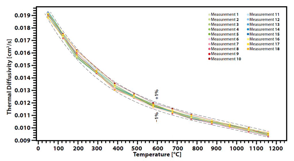 康寧的玻璃陶瓷Pyroceram作為各種應(yīng)用中的標(biāo)準(zhǔn)材料,使用LFA 1000測量各項(xiàng)熱物理性參數(shù),顯示出超高的熱擴(kuò)散系數(shù)重復(fù)性。8次單獨(dú)測樣過程使用18個同一樣本不同位置切出的樣品。實(shí)驗(yàn)結(jié)果表明,在1250°C以下溫度范圍內(nèi),熱擴(kuò)散系數(shù)值范圍偏差在±1%之間。