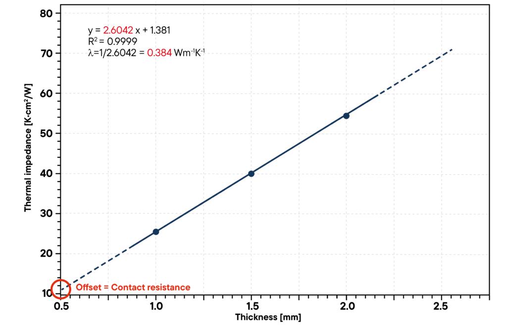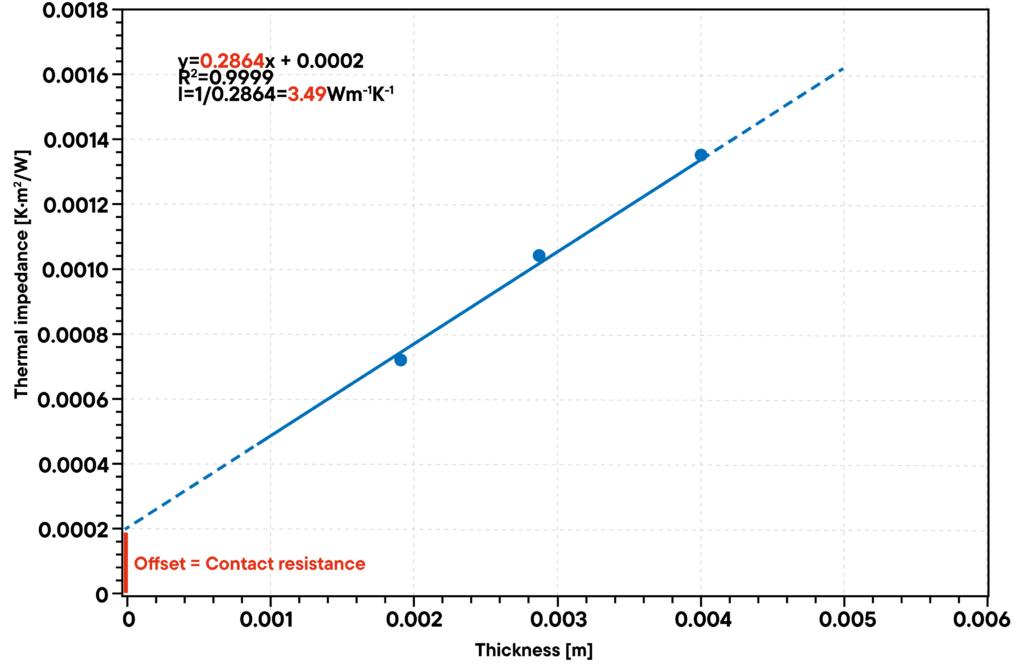 在 50 °C(TH = 70 °C,TC = 30 °C)溫度下測(cè)量 25 mm x 25 mm 導(dǎo)熱墊(Ⅱ 類樣品)的熱阻(導(dǎo)熱系數(shù))。如圖所示,測(cè)量了厚度在 2.01 mm 至 3.02 mm 之間的三個(gè)不同樣品,以確定其接觸熱阻(使用線性回歸法)。