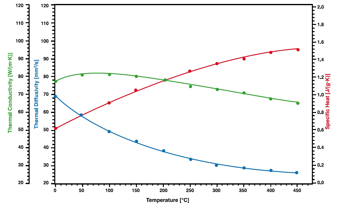 這幅圖顯示了Linseis LFA 1000測量的熱擴(kuò)散系數(shù)和日本AIST*測量值的對比。這種各向同性石墨的測量值與AIST測量的標(biāo)準(zhǔn)值相差只有不到2%。 . *(AIST是National Institute of Advanced Industrial Science and Technology, Japan的縮寫)