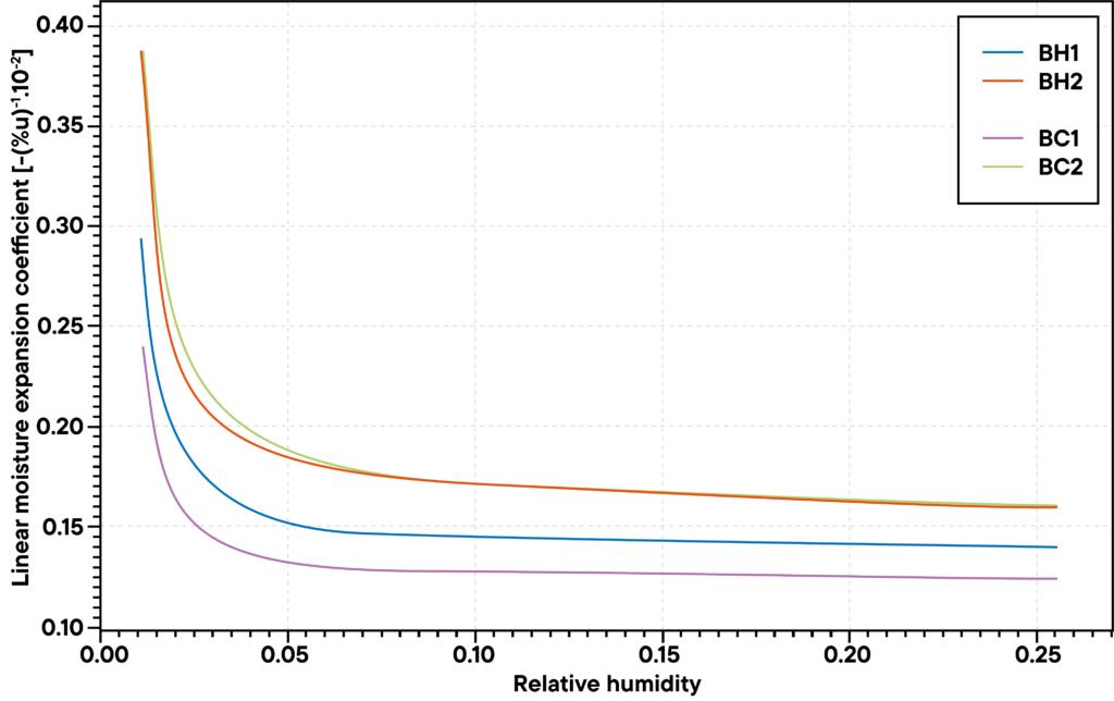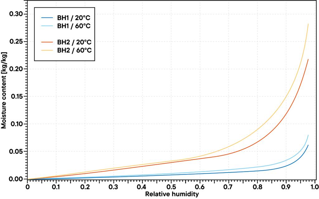 此應(yīng)用示例展示了水分和濕度對磚塊材料的影響,如下圖的曲線顯示了兩種磚在 20 ℃ 和 60 ℃ 下的等溫線以及樣品吸附的水分含量。此外,從圖 2 可以看到與濕度相關(guān)的熱膨脹系數(shù)(CTE),濕度等級對熱膨脹行為有顯著影響。