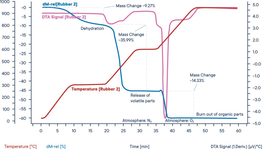 在第二個反應(yīng)階段,在氮氣氣氛下,揮發(fā)性成分通過熱解作用釋放出來。這些成分的含量為 36.0 % 。它們的釋放可以通過差熱分析曲線上的一個放熱反應(yīng)峰來識別。對于第三個反應(yīng)階段,將氣氛切換為氧氣,這使得剩余的碳發(fā)生燃燒。失重率為 14.3 % 。剩余的 40.4 % 是諸如灰分、熟石灰或填料之類的無機(jī)成分。