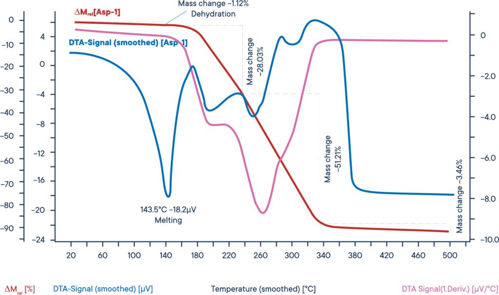 所測量的阿司匹林(ASA)樣品呈現(xiàn)出以下情況:在加熱過程開始時,一些吸附水被釋放出來,導(dǎo)致約 1 % 的重量損失。當(dāng)溫度達(dá)到 140 °C 時,阿司匹林達(dá)到熔點,從而引發(fā)了一個吸熱反應(yīng),這在差熱分析(DTA)曲線上得以測量體現(xiàn)。在 160 °C 時,熔融狀態(tài)的藥物分幾個階段發(fā)生分解。分解產(chǎn)物具有揮發(fā)性,最終導(dǎo)致總重量損失幾乎達(dá)到 100 % 。