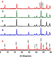 圖1 Ca3Co4-xCrxO9樣品的粉末X射線衍射圖譜,X分別為(a)0.00、(b)0.01、(c)0.03、(d)0.05和(e)0.10;