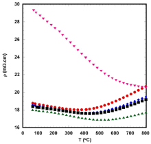 圖5 不同Cr含量的Ca3Co4-xCrxO9試樣中電阻率隨溫度的變化,X分別為(●)0.00、(◆)0.01、(■)0.03、(▲)0.05和(▼)0.10