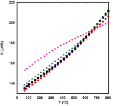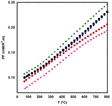 本文表明Cr可以在不改變晶體結(jié)構(gòu)和改善熱電性能的情況下,以較小的比例(x≤0.05)取代Ca3Co4-xCrxO9中的Co。由于Ca1-yCryO非熱電二次相的形成,進(jìn)一步加入Cr會降低熱電性能。根據(jù)在50 °C和800 °C時的測定的功率因數(shù)的值,確定了Co取代Cr的最佳含量為摻有0.05 Cr的樣品,功率因數(shù)在50 °C和800 °C時的最大值分別為0.11 mW/K2和0.25 mW/K2,比未摻雜樣品高25%左右。