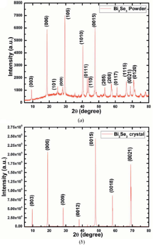 圖4 (a)生長的Bi2Se3粉末XRD圖譜;(b)生長的Bi2Se3裂解單晶的XRD圖譜。