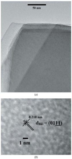 圖6 (a)顯示分層結構的Bi2Se3單晶的透射電鏡圖像和(b)顯示條紋晶格的高分辨率透射電鏡圖像