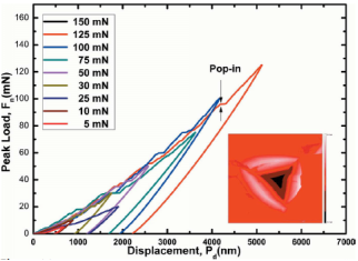 圖11 硒化鉍單晶的負載-位移曲線。圖中的插圖顯示了(001)平面壓痕后的典型壓痕。