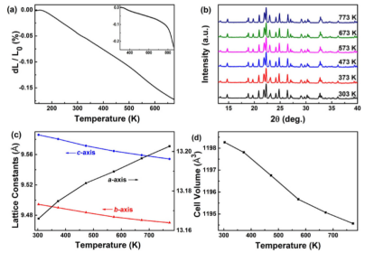圖1:相對長度變化和溫度依賴性XRD。(a) ZrScMo2VO12柱體的相對長度隨溫度從135~673K和RT~873K的變化(插圖);(b)ZrScMo2VO12的溫度依賴性XRD圖譜;(c)ZrScMo2VO12的晶格常數(shù)和(d)晶胞體積隨溫度的變化。