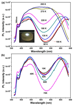 圖2:溫度依賴性光致發(fā)光(a,b)在345nm激發(fā)下ZrScMo2VO12的溫度依賴性PL光譜。插圖(a)中的光學(xué)照片是在345nm的輻照下拍攝的。