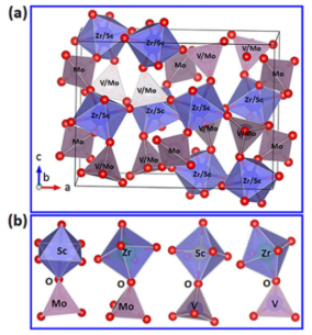 圖4:ZrScMo2VO12和Zr/Sc-O-Mo/V多面體結(jié)構(gòu)示意圖。(a) ZrScMo2VO12積木示意圖(紅色球體表示氧原子);(b)ZrScMo2VO12中Zr/ScO-Mo/V多面體結(jié)構(gòu)示意圖(紅球表示氧原子)。