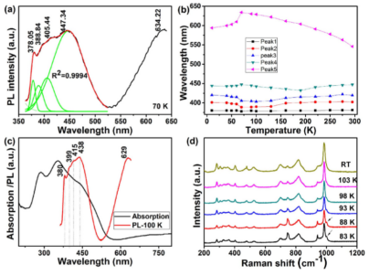 圖5:光致發(fā)光光譜反褶積、室溫紫外-可見吸收光譜和低溫拉曼光譜。(a) PL光譜反褶積為三個窄帶和兩個寬帶;(b)PL峰值位置隨溫度的變化;(c)室溫下的紫外-可見吸收光譜和100K下的PL光譜;(d)ZrScMo2VO12的低溫拉曼光譜。
