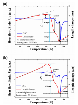 圖2:比較了(a)鑄態(tài)玻璃和(b)退火玻璃1在玻璃液轉變和隨后結晶過程中的DSC跟蹤和線性熱膨脹。