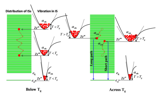 圖3:鑄態(tài)玻璃態(tài)、退火玻璃態(tài)和結晶玻璃態(tài)1的勢能圖描繪了振動和構型對玻璃-液體轉變下方(左圖)和橫向(右圖)熱膨脹的貢獻。固有結構(ISs)的分布表明了ISs的可能能量值,從下面以理想Kauzmann玻璃的最低能量eK為界。結晶態(tài)的能量用ecr表示。每種材料的振動特性都是由溫度控制的。
