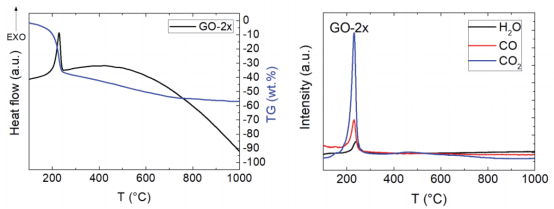 圖6:惰性氣體中GO-2x:STA的熱分析(左)和惰性氣體測量過程中逸出氣體的質(zhì)譜(右)