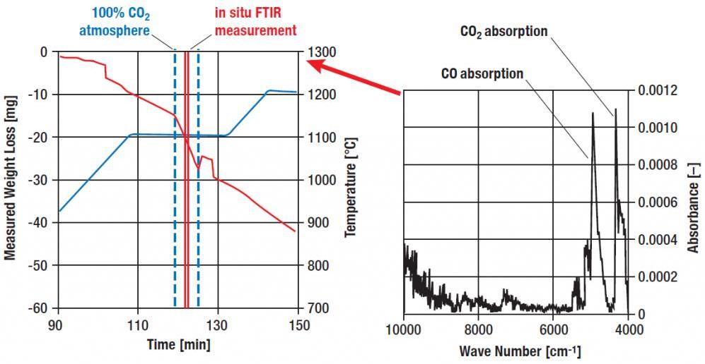 所有林賽斯吸附系統(tǒng)都可以與諸如傅里葉變換紅外光譜儀(FTIR)等額外的分析工具聯(lián)用。在本實(shí)驗(yàn)中,木炭樣品在 CO2 氣氛中發(fā)生了氣化。為此,將木炭樣品放置在設(shè)備中,并在恒定的 CO2 壓力下升高溫度。在 1100 ℃ 的恒溫階段,觀(guān)察到了巨大的質(zhì)量損失,這表明結(jié)合態(tài)的碳發(fā)生了氣化(根據(jù)反應(yīng)方程式 C + CO2 ? 2CO)。