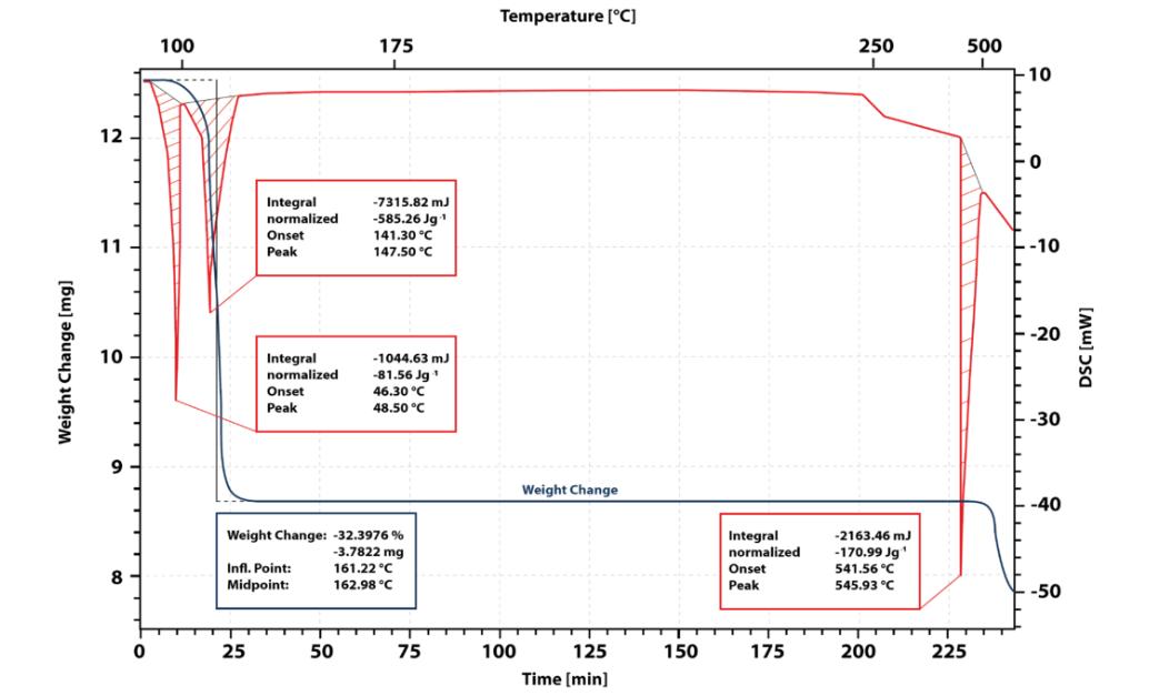 上圖展示了測(cè)量結(jié)果,藍(lán)色曲線(xiàn)表示質(zhì)量損失,紅色曲線(xiàn)表示差示掃描量熱(DSC)信號(hào)。DSC 信號(hào)中的第一個(gè)峰對(duì)應(yīng)著樣品的熔化過(guò)程。熔化峰的起始溫度為 46 ℃ 。在樣品完全熔化后,出現(xiàn)了第二個(gè)吸熱峰,其起始溫度為 141 ℃ 。熱重(TG)信號(hào)顯示,在這個(gè)溫度范圍內(nèi)樣品質(zhì)量損失了 32 % ,這表明四水合硝酸鈣發(fā)生了脫水反應(yīng),生成了固態(tài)的無(wú)水鹽。在 180 ℃ 等溫保持期間,樣品未發(fā)生進(jìn)一步的變化,這表明該溫度是干燥該鹽并得到無(wú)水鹽的理想溫度。當(dāng)再次加熱到 541 ℃ 時(shí),觀察到一個(gè)吸熱峰,這對(duì)應(yīng)著無(wú)水鹽的熔化。然而,熱重(TG)信號(hào)顯示出質(zhì)量損失,這表明該鹽在熔化時(shí)發(fā)生了分解。因此,無(wú)法直接測(cè)量熔融無(wú)水鹽的熔化焓和熱容。